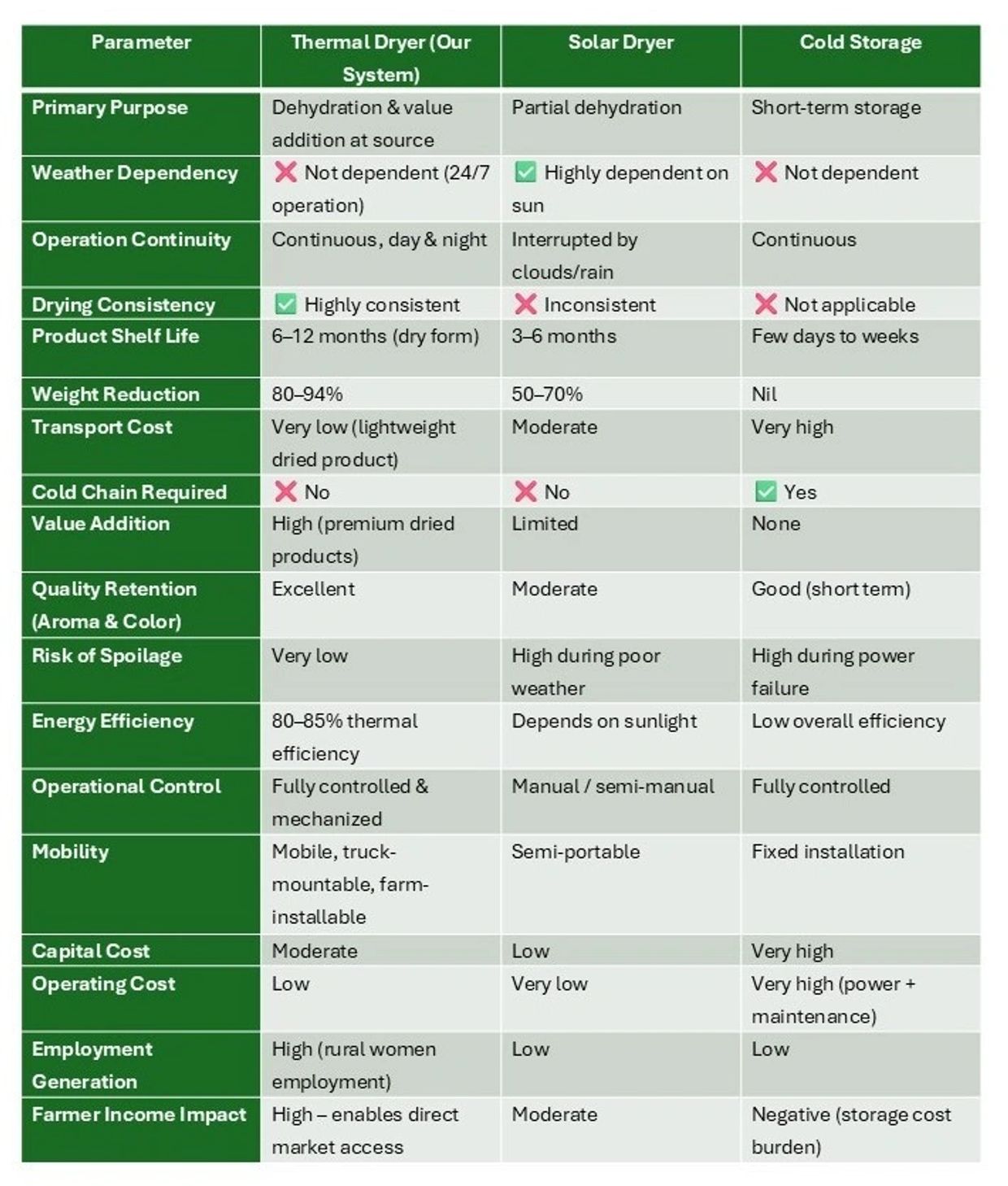 Thermal drying is the only solution that combines preservation, value addition, logistics savings, and income generation — all at the farm level.